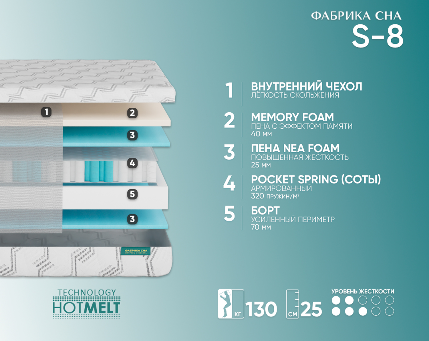| Пружинный блок (армированный) | Pocket Spring 7 zon 320 шт.м2 |