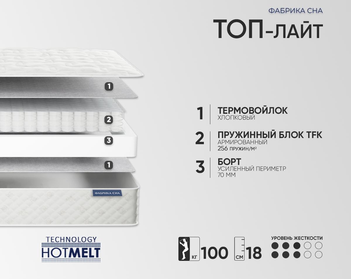 Матрас Топ Лайт, при своем простом устройстве, очень удобен. Его можно смело назвать лидером среди матрасов бюджетного формата. Его конструкция проста и надежна. Внешний вид можно сравнивать с матрасами Премиум класса.